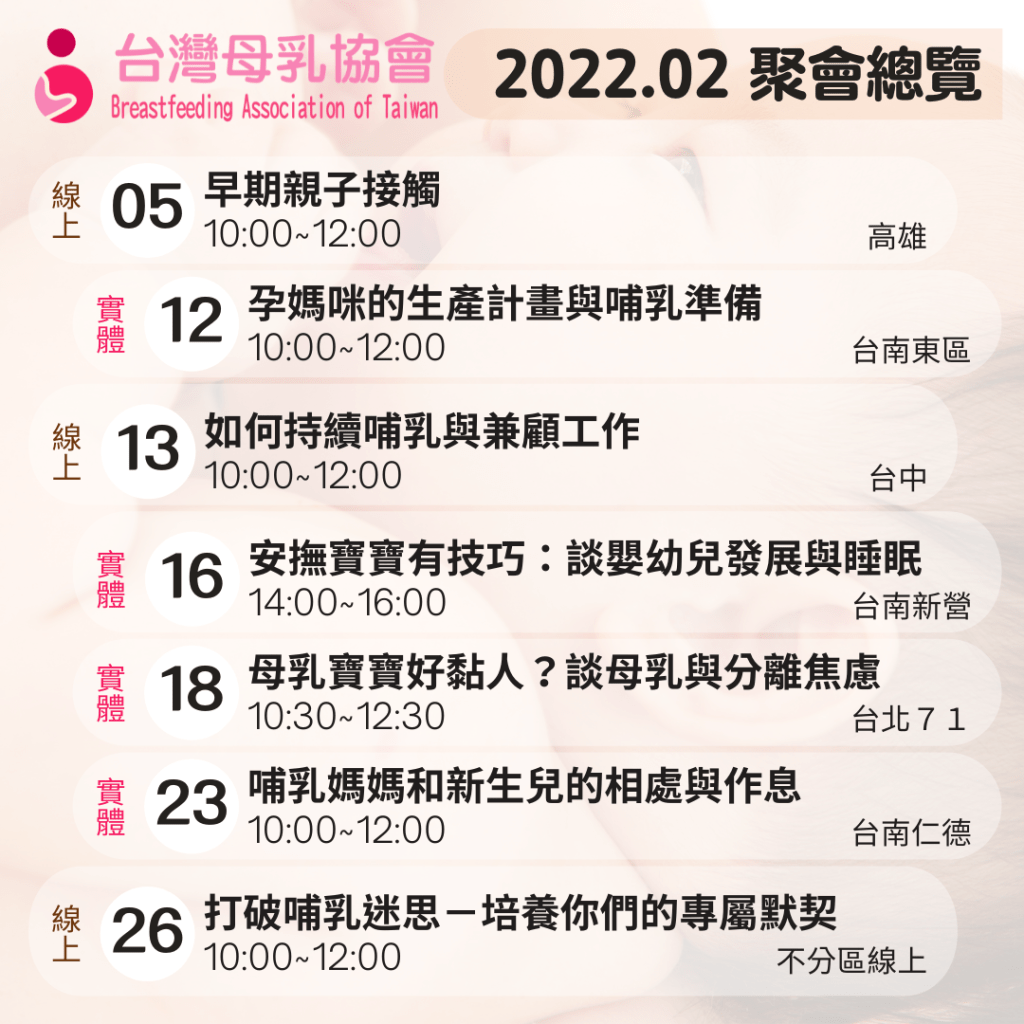 台灣母乳協會在台灣各地持續辦理母乳支持聚會,希望能夠透過經驗傳承的方式使更多媽媽能順利哺乳,聚會以分享方式進行,請大家不要拘束,帶著大寶小寶一起來,隨時可以離開座位再加入,要餵奶換尿布吃東西….都很自在,是個媽媽寶寶交朋友的園地喔!