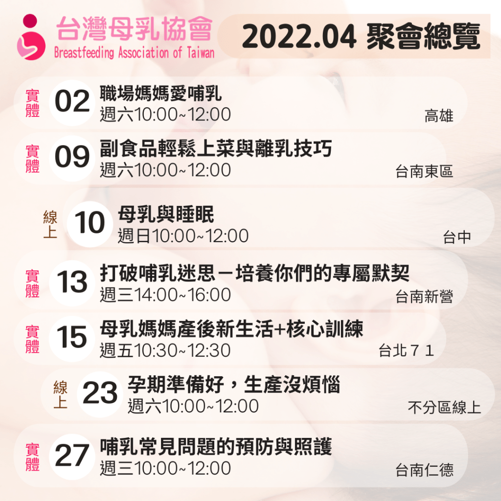 台灣母乳協會在台灣各地持續辦理母乳支持聚會,希望能夠透過經驗傳承的方式使更多媽媽能順利哺乳,聚會以分享方式進行,請大家不要拘束,帶著大寶小寶一起來,隨時可以離開座位再加入,要餵奶換尿布吃東西….都很自在,是個媽媽寶寶交朋友的園地喔!