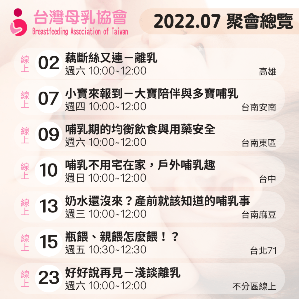 報名網址:台南市母乳支持聚會(線上聚會先入LINE群再報名)