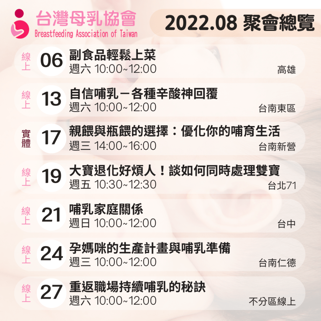 台灣母乳協會在台灣各地持續辦理母乳支持聚會,希望能夠透過經驗傳承的方式使更多媽媽能順利哺乳,聚會以分享方式進行,請大家不要拘束,帶著大寶小寶一起來,隨時可以離開座位再加入,要餵奶換尿布吃東西….都很自在,是個媽媽寶寶交朋友的園地喔!