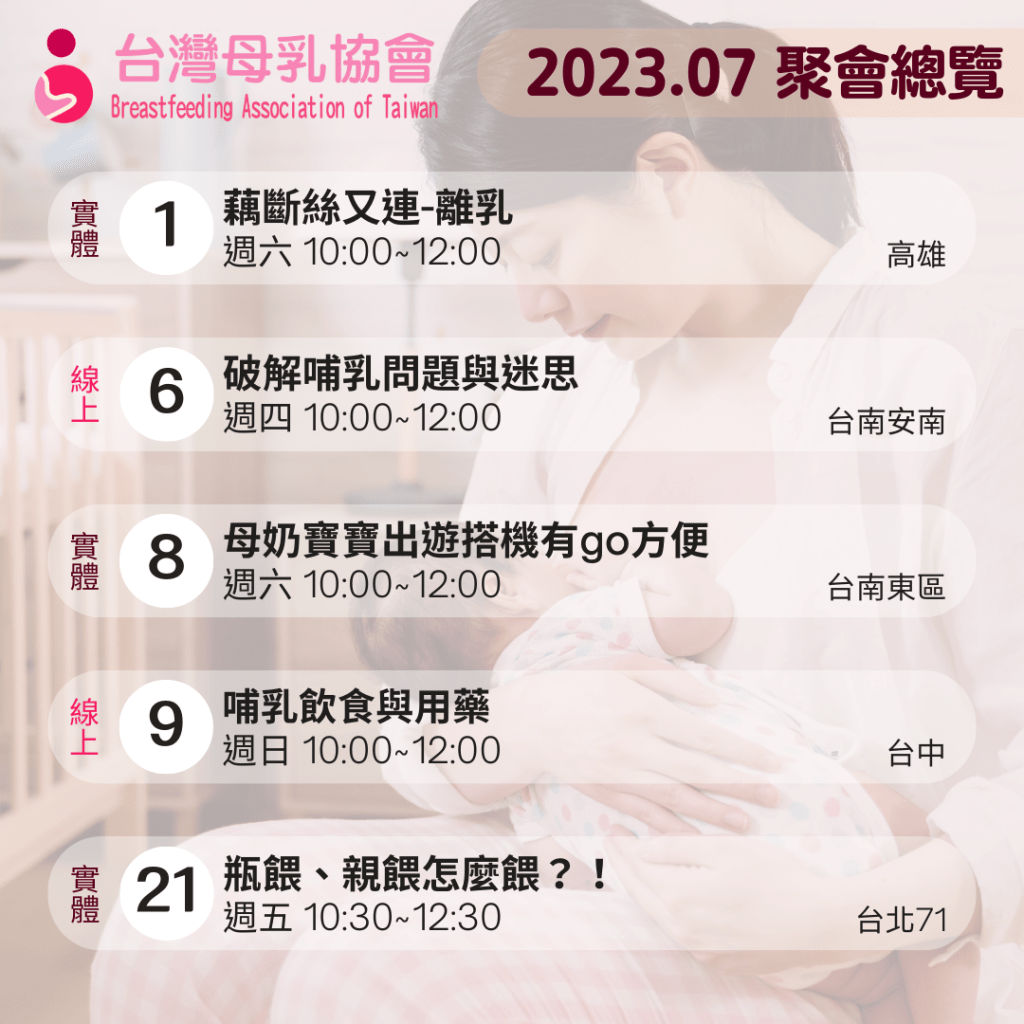 台灣母乳協會在台灣各地持續辦理母乳支持聚會,希望能夠透過經驗傳承的方式使更多媽媽能順利哺乳,聚會以分享方式進行,請大家不要拘束,帶著大寶小寶一起來,隨時可以離開座位再加入,要餵奶換尿布吃東西….都很自在,是個媽媽寶寶交朋友的園地喔!