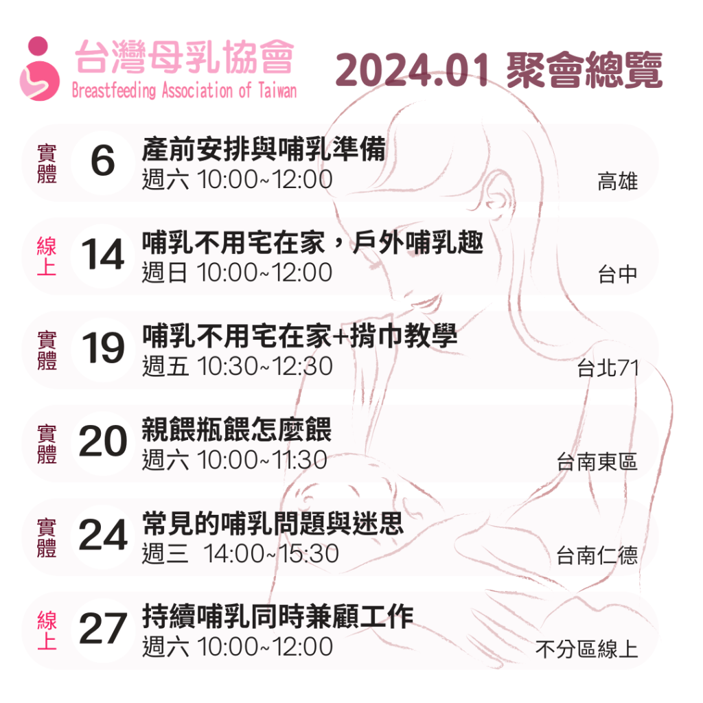 台灣母乳協會在台灣各地持續辦理母乳支持聚會,希望能夠透過經驗傳承的方式使更多媽媽能順利哺乳,聚會以分享方式進行,請大家不要拘束,帶著大寶小寶一起來,隨時可以離開座位再加入,要餵奶換尿布吃東西….都很自在,是個媽媽寶寶交朋友的園地喔!