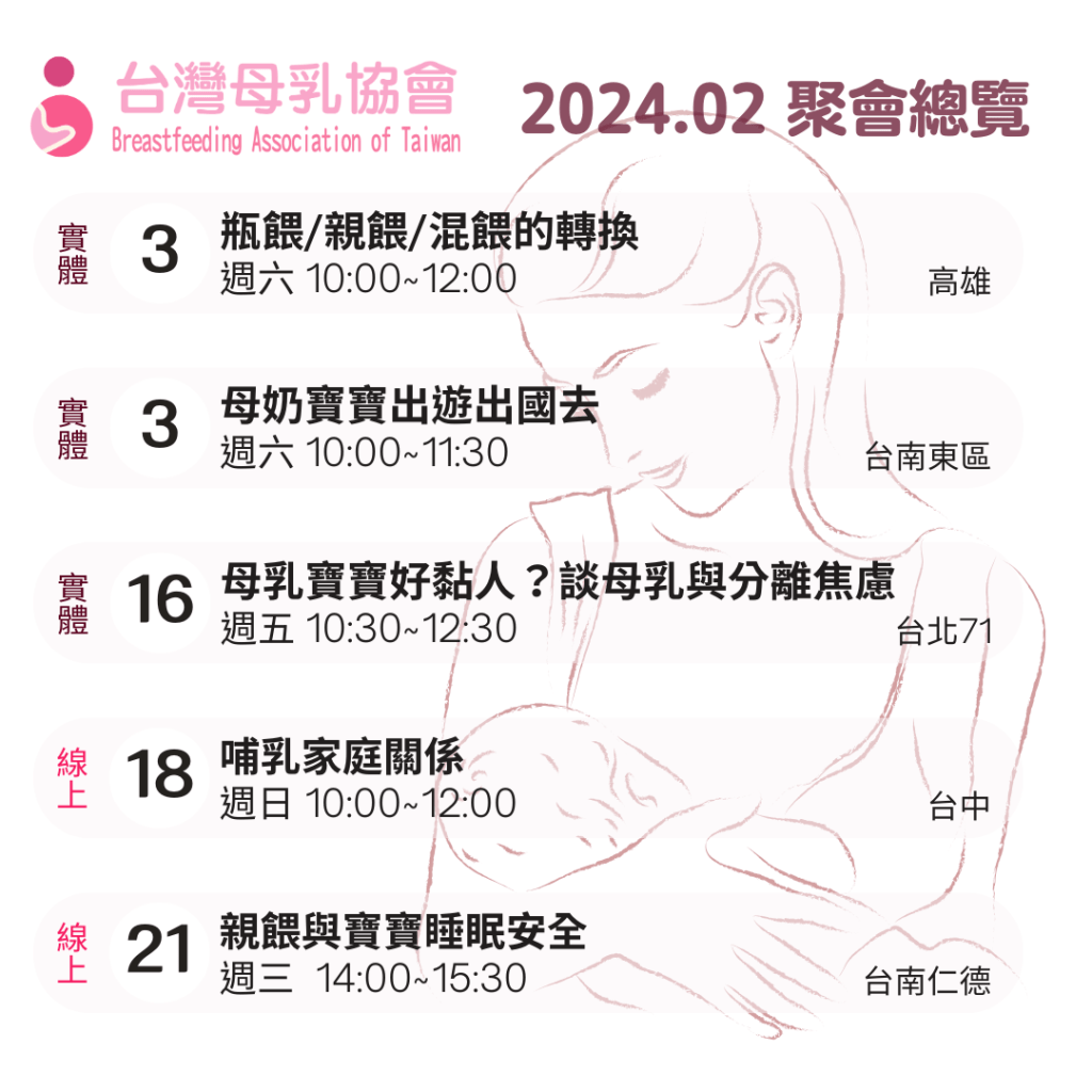 台灣母乳協會在台灣各地持續辦理母乳支持聚會,希望能夠透過經驗傳承的方式使更多媽媽能順利哺乳,聚會以分享方式進行,請大家不要拘束,帶著大寶小寶一起來,隨時可以離開座位再加入,要餵奶換尿布吃東西….都很自在,是個媽媽寶寶交朋友的園地喔!