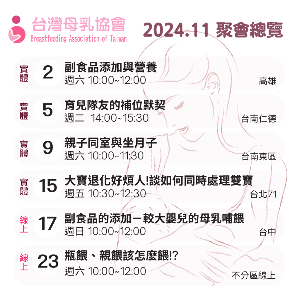 台灣母乳協會在台灣各地持續辦理母乳支持聚會,希望能夠透過經驗傳承的方式使更多媽媽能順利哺乳,聚會以分享方式進行,請大家不要拘束,帶著大寶小寶一起來,隨時可以離開座位再加入,要餵奶換尿布吃東西….都很自在,是個媽媽寶寶交朋友的園地喔!