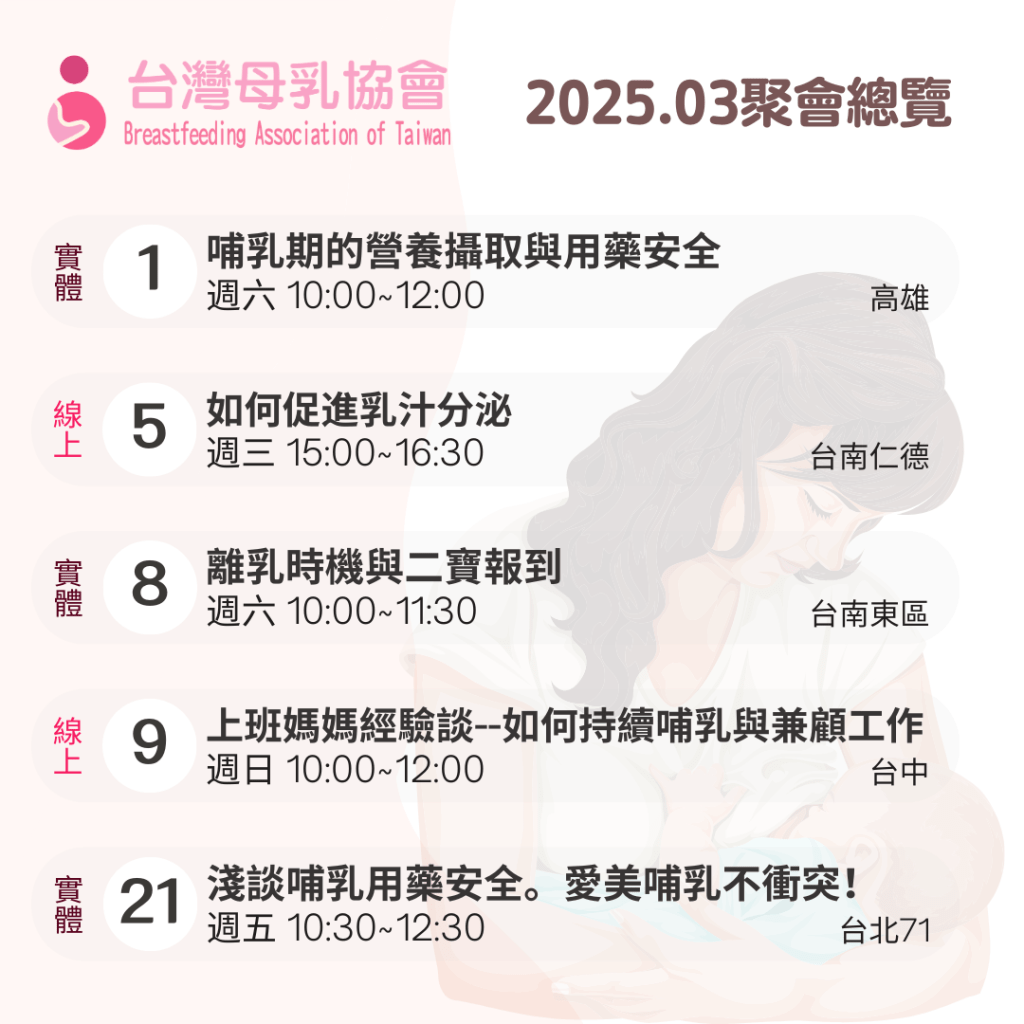 台灣母乳協會在台灣各地持續辦理母乳支持聚會,希望能夠透過經驗傳承的方式使更多媽媽能順利哺乳,聚會以分享方式進行,請大家不要拘束,帶著大寶小寶一起來,隨時可以離開座位再加入,要餵奶換尿布吃東西….都很自在,是個媽媽寶寶交朋友的園地喔!